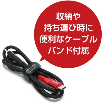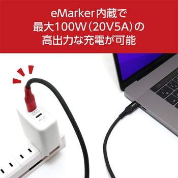 USB PD 対応、eMarker内蔵のUSB Type-C 充電ケーブル高耐久でやわらかく絡みにくいので取り回しやすい大容量充電を可能にするUSB PD対応Type-C 充電ケーブルeMarker内蔵で100W充電対応安心の熱感知センサー搭載わかりやすいアルミカラーリングコネクタ採用やわらかく絡みにくいファブリックケーブル採用屈曲テスト50,000回をクリア収納や持ち運び時に便利なケーブルバンド付属USB2.0準拠の通信ケーブルとしても使用可能