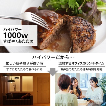 仕様高出力の継続時間:1000W(最大1分30秒、後600W) 、900W(最大3分、後600W)質量(kg)約9色ブラック出力(W)1000/900/600/500/200/100周波数(Hz)50/60定格電圧(V)AC100定格消費電力(W)1420寸法(幅W×奥行D×高さH)(mm)約460×350×275(ドアハンドル含まず)センサー赤外線センサー電源コード(m)約1.4モードメニューモード:あたため・解凍・飲みもの・冷凍食品庫内寸法(mm)約315×330×195年間消費電力量(kWh/年)58.2省エネ基準達成率(%)103設置条件上面は15cm以上、両側面10cm以上、背面は10cm以上スペースが必要内容量1個