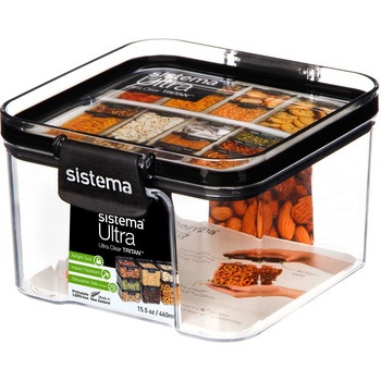 システマ製のフードコンテナ「ウルトラ・460ml」です。クリップ式の簡単ロックです。密閉力にすぐれています。モジュール設計で、サイズ違いもきれいにスタッキングできます。トライタンを使用し、ガラスのようにクリアで丈夫で壊れにくいです。BPA&フタル酸エステル類フリー。食器洗浄機がご使用できます。