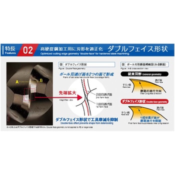 焼きばめホルダに適したショートシャンクタイプ×ストロングネックタイプが登場。ストロングネックタイプは従来最短⾸下⻑アイテムよりも太く短い首形状で折損のリスクを低減します。⾼い工具剛性により安定性・信頼性や加工精度が向上します。特に工具径が⼩さくなるほど効果的です。新開発した次世代ハードコーティングTH3を採用、高硬度鋼の加工において優れた耐摩耗性を発揮。高硬度鋼加工用・新コーティング TH3を採用。高硬度鋼加工用刃形ダブルフェイス形状。高硬度鋼を追求した工具設計。