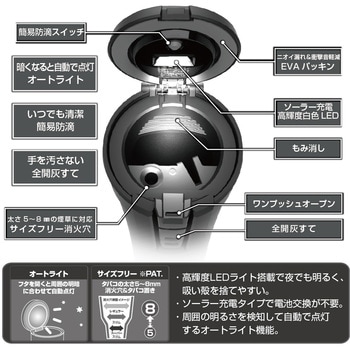 ワイド開口ビッグボディで約200本の吸い殻を捨てられるXLサイズの灰皿です。「全開灰すて」機能でフタが消火部ごと大きく開き、吸い殻が捨てやすい設計です。 ※誤作動防止のロック機能が付いています。溜まった吸い殻が引っかからず捨てることが出来ます。簡易防滴設計になっていますので、汚れた灰皿を注水で濯ぎ洗いをすることが出来ます。スーパースリム~レギュラーサイズのタバコ対応の消火穴とタバコ置を備えています。ソーラー+オートライト(白LED)で周囲の明暗に合わせて自動点灯します。