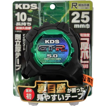 通常品はテープの表と裏の印字が同じであるため、テープの計測側の表と裏は尺とcmが逆になってしまうが、このコンベックスはテープ裏の印字を変えることによりテープの計測側の表と裏の尺・cm目盛が常に同じになる。