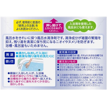 入浴後一錠入れるだけで、沸かしなおし時のヌメリ、ニオイを防ぎます。沸かしなおして節水にもなります。