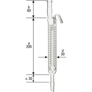 内部はらせん状に巻かれたガラス管内に冷却水を通すことによって下部からの蒸気を効率よく冷やすことが可能な冷却器です。