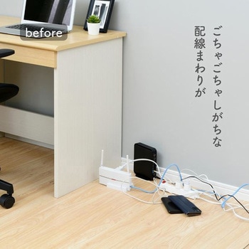 ケーブルをすっきりできる、コード収納ボックス。内側がオープン仕様、壁に付けてすっきり隠せます。スリット入りの天板で、ケーブルを出して充電可能。巾木避け加工がされていて、ぴったり壁付けもできる。設置面はフラットで、シリコン製の滑り止めシールも付属。