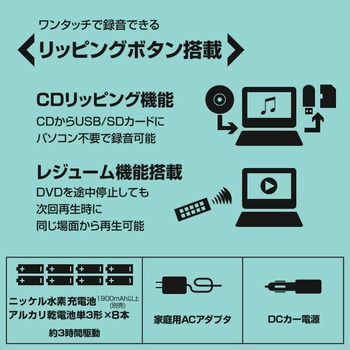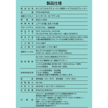 用途CPRM対応 9インチ フルセグチューナー内蔵 車載用バッグ付き 3電源対応(AC/DC/充電電池)セット内容本体、リモコン、リモコン用電池(単4形乾電池×2本)、AC電源アダプター、シガー電源アダプター、AVケーブル、車載用ケース、ワンセグ用アンテナ、取扱説明書、mini B-CASカード色ブラック質量(g)847電源(V)AC100-240(家庭用ACアダプター)、DC12(車載用シガー電源アダプター)、ニッケル水素充電池単3形×8本(1900mAh以上)(別売)、アルカリ乾電池単3形×8本(別売)消費電力(W)約10ディスプレイ9インチ(16:9)解像度800×480保証期間1年視野角上下120度、左右140度対応メディアDVD、DVD-R、DVD-RDL、DVD-RW、CD、CD-R、CD-RW、SD、USBメモリー(最大16GBまで)寸法(幅W×奥行D×高さH)(cm)24.8×17.9×5.4入力端子AV入力端子対応フォーマットDVD-Video、DVD-VR、CPRM、CD-DA、MPEG4、MP3、JPEG出力端子AV出力端子、イヤホン端子受信チャンネル(ch)地上デジタル放送(UHF13-62、CATV C13-C62)内容量1台