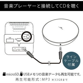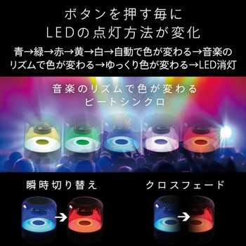 5色のLEDがサウンドとシンクロして輝く。ボタンを押すごとにLEDの点灯方法が変化。リチウムイオン電池1200Ah内蔵。コードレスなので場所を選ばず使用できます。microSD、USBメモリの音楽データも再生可能(ラインケーブル付属)。FMラジオ機能搭載。