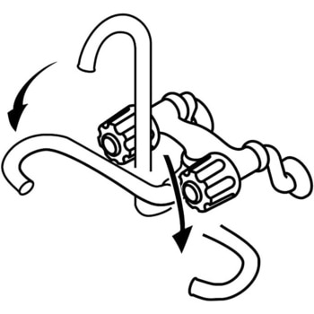 シングルレバーやサーモスタットと比べて内部構造が簡単なので水漏れした際の修理が簡単です。また、交換部品もメーカー問わず適合する場合が多く補修に適しています。【定番のツーバルブ混合栓】お湯と水が分かれていて、ハンドルを回すだけの簡単な吐水法です。様々な世代から支持されています。吐水パイプを倒して収納することが出来ます。実験室やミニバーなど台の下に吐水口が収納できます。高さが約166mm上がるのでシンクを広々使用できます。