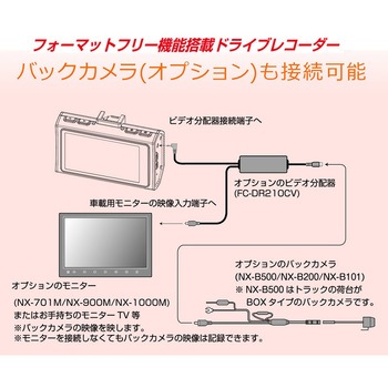用途バックカメラの映像をFC-DR210へ記録できる付属品取付けステー×1、ステー用両面テープx1、カー電源コード(約 3.5m)×1、microSDHCカード(16GB)×1、取扱説明書 ×1質量(g)約70 取付けステー装着時 約85(microSDHCカード含む)センサーGセンサー:有り(オフ、1~5)5段階調整電源電圧(V)DC12/24記録媒体microSDHC(16GB付属)/ 4~32GB対応(Class10以上)消費電流(mA)約220(DC12V時)、約120 (DC24V時)解像度記録:1920×1080 (Full HD)、 1280×720 (HD)保証期間3年間 (microSDHCカード等 消耗品除く)撮像素子CMOS記録ファイル形式【映像】動画 AVI(H.264)画面サイズ2.7インチ液晶モニター画素数200万画素フレームレート27.5fps画角【レンズ】水平 約110度 垂直 60度(130度対角)動作温度範囲(℃)-10~60寸法(幅W×高さH×厚さt)(mm)約79×約49×約25、取付けステー装着時高さ:約104 (突起部分含まず)内容量1個