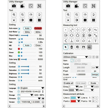 仕様(インター フェイス)HDMI出力(1080p)×1/USB2.0×2(操作用マウス・USBメモリー接続用)、(有効画素)(カメラ)2592×1944サイズ(ピクセル)2μm×2μm電源DC12V 2A/AC100-240V 50/60Hz(ACアダプター付属)機能二次元計測機能 /ズーム表示/スケール表示 /電子ライン表示/画像反転表示/静止画保存(BMP.JPEG選択可 2592×1944)/計測機能内のスクリーンキャプチャでの静止画保存(JPEGのみ 1920×1080)/動画保存(AVI 1920×1080 30fps)構成(製品)カメラ本体×1/カメラ用ACアダプター×1/USBメモリー×1(※試供品)/USBマウス×1(※試供品)ディスプレイ(液晶)11.6インチ/1920×1080/30fps撮像素子1/2.8インチCMOS言語表示英語・中国語(簡体字・繁体字)の 3種から選択切替式(日本語無し)アズワン品番3-3339-41マウント(カメラ)Cマウント内容量1個