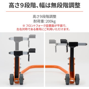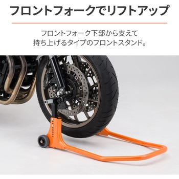 フロントフォーク下部から支えて持ち上げるタイプのフロントスタンド。カウルに干渉したりステム下に穴がないなど、フロントスタンドが使えない車両に最適です。リフトアップ面はカウンターウエイト(重り)によって常に上を向く構造なので簡単にリフトアップが可能。フロントを持ち上げて行なう整備に便利です。