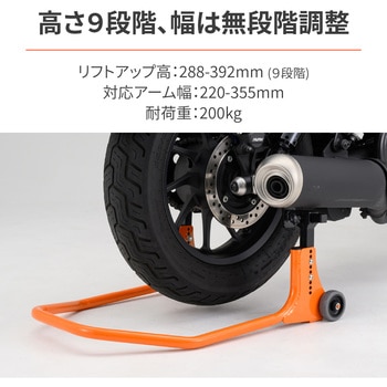 チェーン調整、リアタイヤを取り外す作業などリア周りのメンテナンスには欠かせないリアスタンドです。オフセットアタッチメントによりレブル250などのマフラーが干渉してしまう車両でも、マフラーの脱着をせずにリフトアップが可能になります。リアスタンド本体は、新形状フレームと鋳造アームの採用により安心の剛性感。リフトアップ時にはローラーが浮いてフレームが接地する構造にすることで、作業時の安定感が向上。