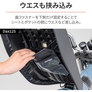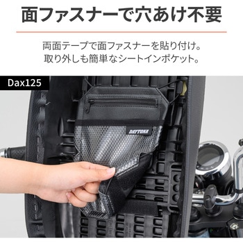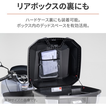 シート下の隙間を有効活用。シート裏側にポケット装着。メットインがない車両でもシート裏に書類が入るポケットを装着できます。収納場所に困る車検証・自賠責保険などの書類や、充電ケーブルなどの小物をスッキリ収納。面ファスナーで取り付けるため、シートに穴を開けることなく取り付けできます。面ファスナーと伸縮バンドを組み合わせれば、シートとポケットの隙間にウエスなどの小物をはさみ込むこともできます。リアボックスのフタ裏に装着すれば、ケースのデッドスペースも有効活用。