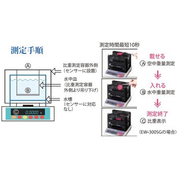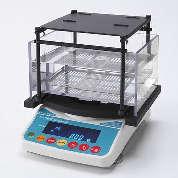 最大3kgまで測定可能、いままで困難であった重い物が簡単に測定できます。比重と重量は最小表示0.01、さらに補助表示で0.001まで測定できます。比重測定容器フタは折りたたみ式になっており、測定物の大きさに合わせた使い方ができます。測定値は更新できるので、吸水性のある物等の比重や体積の変化率を求めることができます。大きく特殊な形状の測定物用の特殊容器を作成できます