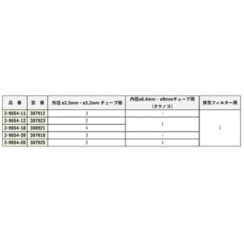 外径Φ2.3mmチューブ用フィッティング×3本、外径Φ3.2mmチューブ用フィッティング×3本、ブラインドプラグ×2本