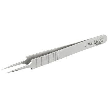先端部の厚み0.1mm、幅0.15mmの超極細チップタイプです。材質は航空機エンジンやインプラント・人工関節に使われるコバルトクロム合金のため、腐食しにくく耐熱性にも優れています。グリップ部には握りやすい溝加工が施されており、指先の通気性も良く快適な作業性です。