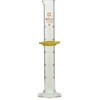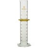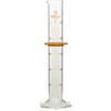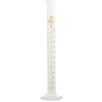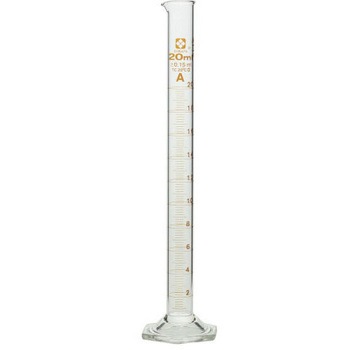 液体の体積を測定するための目盛の付いた細長い円筒容器です。注ぎ口があり、液体を測りとるのに用いられます。目盛は受入体積(入っている体積)を表し、受用(入用)を意味するTCを表示しています。(TC:ToContainの略)目盛は20℃の水を測定したときの体積を表します。JIS規格(R3505)クラスAの「体積の許容誤差」より高精度です。
