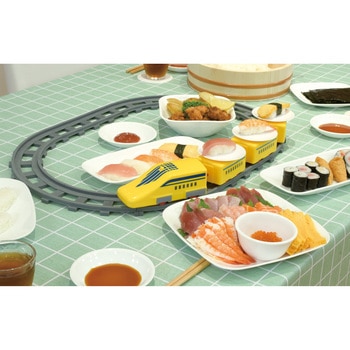 先頭車両×1、先決車両×3、直線レール×2、曲線レール×8、寿司皿×6枚(サイズ:Φ90×H10mm)