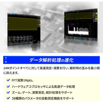 【高速波形キャプチャと大容量メモリ】最大400,000wfm/sの波形更新レート(シーケンスモード)と14Mptsの大容量メモリにより、過渡現象や低頻度の事象を逃さず捉えます。1Mpts FFT解析にも対応し、高精度な周波数解析を実現します。