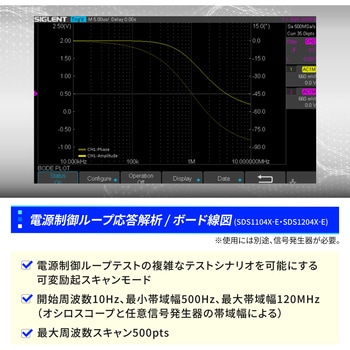 【データ解析と電源設計支援】ハードウェアコプロセッサによる高速演算処理でズーム、ゲート、統計、38種類の自動測定を効率的に実行可能。さらにボード線図機能を標準搭載(SDS1104X-E・SDS1204X-E)。電源制御ループの応答解析を低コストで実現(別途、信号発生器が必要)。トリガはエッジ、スロープ、パルス幅、ウィンドウ、ラント、ドロップアウト、パターン、ビデオ対応。