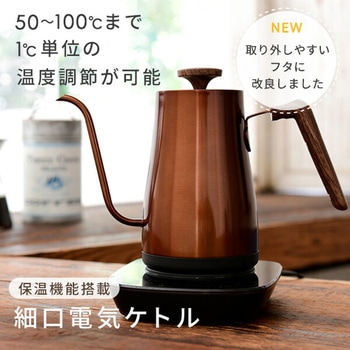 細口ノズルと安定したハンドルでハンドドリップに適した電気ケトル。蓋を改良して取り外しやすくなりました。温度設定範囲は50~100度まで設定可能。白湯や野菜洗いにもご利用できます。薄型操作部はタッチパネル操作対応。分かりやすいデジタル表示。握りやすいグリップで安定したドリップが出来る。細口ノズルで湯量のコントロールも容易。保温機能もついているのでお気に入りの湯音をそのままキープ可能。