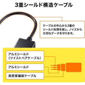 ケーブル部は「アルミシールド(ツイストペアケーブル)→アルミシールド→高密度編組シールド」と3重のシールド処理を施し、ノイズ干渉を防ぎます。