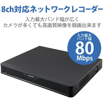 8ch対応ネットワークレコーダー。入力最大バンド幅が80Mbpsと広く、カメラ台数が多くても高画質の映像を録画出来ます。PoE対応でLANケーブル4本だけでカメラを設置設定可能。H.265+/H.265/H.264コーデック対応。