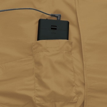 フード内ヘルメット用滑り止め、左袖ペン差し、袖口Wボタン、右内側電池ボックスポケット、左内側バッテリーポケット