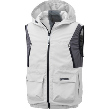 モノトーンでシックなデザインの多収納フード付ベスト。引手を倒すとロックがかかり、起こすとロックが外れるセミオートマチックファスナー搭載。両脇Wポケット。反射テープ付フード。