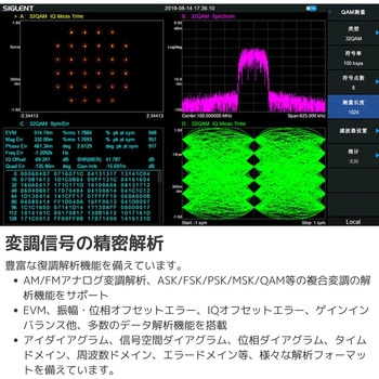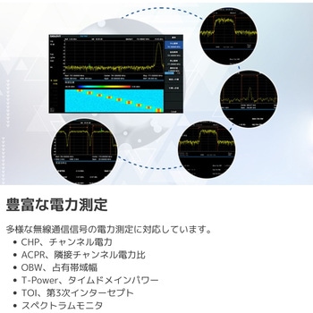【多様な測定&解析】伝送特性測定、VSWR/リターンロス測定(オプション方向性結合器対応)。CHP、ACPR、OBW、CNR、高調波、TOIなど拡張測定キットに対応。AM/FM、ASK/FSK/PSK/QAMの変調解析にも対応可能。
