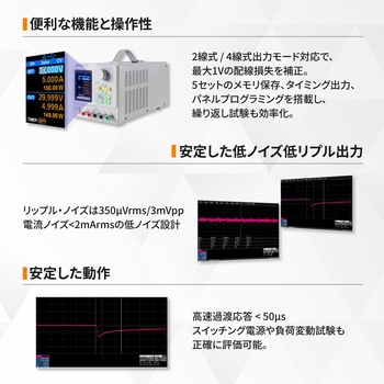 【安定した低ノイズ出力】リップル・ノイズは≤350µVrms/3mVpp、電流ノイズ<2mArmsの低ノイズ設計。高速過渡応答<50µsで、スイッチング電源や負荷変動試験も正確に評価可能。信頼性の高い電圧供給で、精密な試験環境を実現します。