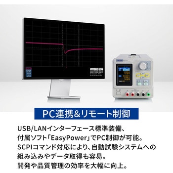 【PC連携&リモート制御】USB/LANインターフェース標準装備、付属ソフト「EasyPower」でPC制御が可能。SCPIコマンド対応により、自動試験システムへの組み込みやデータ取得も容易。開発や品質管理の効率を大幅に向上します。