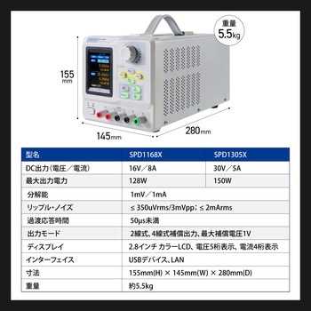 【高精度シングル出力電源】1mV/1mA分解能と5桁電圧・4桁電流表示のリニア電源。研究開発から電子工作、製造ラインまで幅広く対応。高性能温度制御ファンによる静音・安定動作。本体はコンパクト(155×145×280mm/約5.5kg)ながら高出力を実現。
