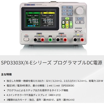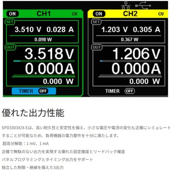 【高精度で安定した出力】SPD3303Xは1mV/1mA、SPD3303X-Eは10mV/10mAの分解能を備え、微小な信号も正確に再現。リップルノイズ300µVrms以下、高速過渡応答<50µsにより、安定した電源供給を実現します。電子回路評価や耐久試験でも信頼性の高い測定が可能です。