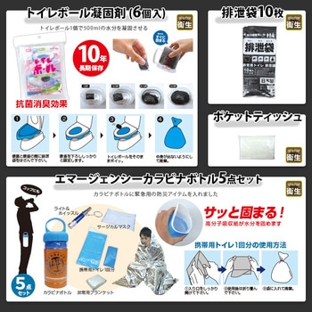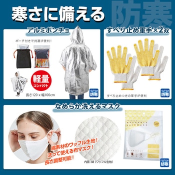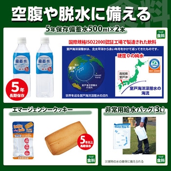 脱水症状や空腹、寒さなど、さまざまな問題に対応できるようにした防災セットです。