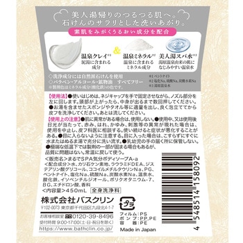 温泉に含まれる保湿成分を配合。(温泉クレイ配合。つるつるな素肌へ。温泉ミネラル&美人湯スパ水配合。うるおいのある素肌に。)洗浄成分には自然派せっけんを採用。泡切れが良く、すっきりした使用感。パラベン・アルコール・鉱物油、すべてフリー吸い込みたくなる新鮮な大気の香り