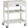 棚板:スチール(焼き付け塗装)、支柱:スチール(焼き付け塗装)、キャスター金具:スチール(メッキ仕上げ)、車輪:ゴム