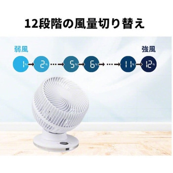 上下90度、左右は40度までの立体送風。お部屋の隅々まで空気を循環でき、洗濯物の乾燥や換気などあらゆる場面で活用できます。また、12段階の風量切り替え機能でやさしい風から強風まで自由に細かく調節可能です。最大風速は7.5m/s。強めの風で空気を一気に循環できます。