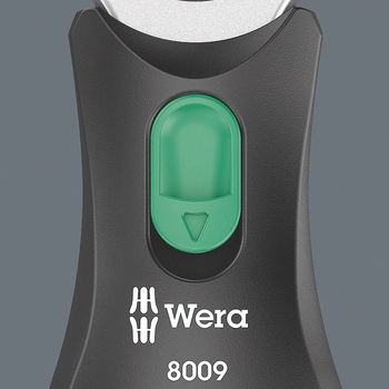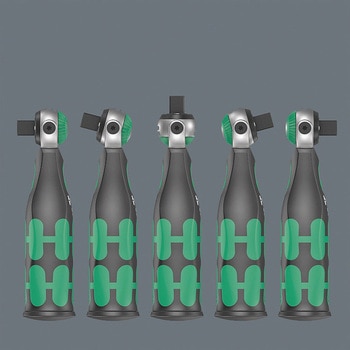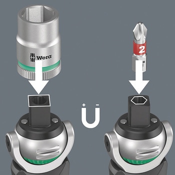 差込口9.5mmのソケットと6.35mmのビットを装着できます。差込口先端の強力マグネットでビットやソケットを保持します。首振り式で角度調整が0°、15°、90°で固定できます。ロータリー式内蔵マガジンには12本のビットが収納できます。コンパクトで携行しやすいデザインです。正逆切替スイッチ付ラチェットタイプです。