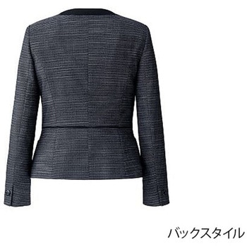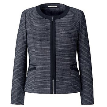 ノーカラージャケットはブラックのトリミングでシャープに