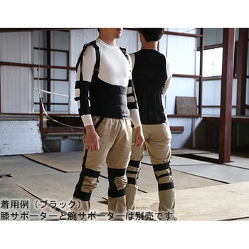 バネの力で作業をアシストする無動力のアシストスーツ重量物のアシスト機能中腰作業のアシスト機能ハードな作業をサポートする特殊高反発スプリングを6本配置。お客様の声で生まれたずり上がり防止帯胸部を開放することで男女兼用設計。丈の調整を可能にしたサスペンダー。姿勢矯正用にテーピング(裏面に装着)