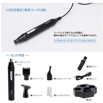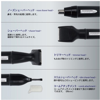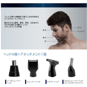 フェイス周りの細部まで身だしなみが決まるメンズグルーミングセットヘッド4種+アタッチメント1種付属 ノーズシェーバー/シェーバーヘッド/トリマーヘッド/スリムシェーバーヘッド(コームアタッチメント)ヘッド部分を水洗いできるのでお手入れが簡単台座付属でスッキリ片付くUSB充電式(専用コード付属)