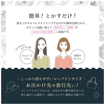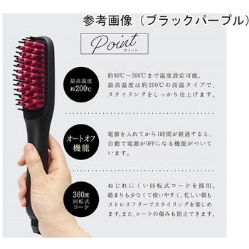 髪をとかすようにスタイリングするだけの簡単仕様。しっかり持ちやすいコンパクトサイズ。マイナスイオン付きでツヤ美髪。約80℃~200℃まで温度設定可能。最高温度は約200℃。電源を入れてから1時間で自動オフ。ねじれにくい回転コードを採用。