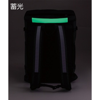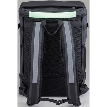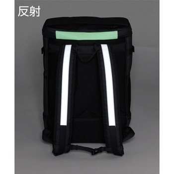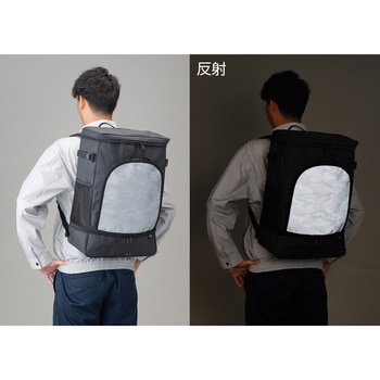 安全靴とヘルメット等、一度に収納してかさばらずに持ち運べます。収納スペースはそれぞれ仕切られているため、他の荷物に匂いや汚れが移りません。素材に撥水性の高いターポリンを使用しています。型崩れしにくく自立するスクエアタイプです。フロントポケットと肩ベルトに高輝度反射材を採用し、前後の夜間安全性も考慮してます。