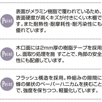 表面がメラミン樹脂で覆われているため、表面硬度が高くキズが付きにくい木棚です。また耐熱性・耐摩耗性・耐汚染性にも優れています。 木口面には2mm厚の樹脂テープを採用し、面取り処理を施すことで、角部の安全性にも配慮しています。