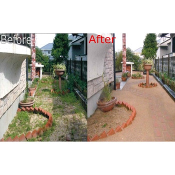 土の風合いを活かしながら雑草を抑える自然土防草材 + 舗装表面の黒ずみや汚れを抑制