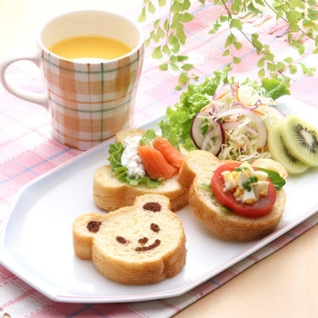 焼き上がったパンをスライスしてチーズや野菜・ハムなどをのせてカナッペ風に。