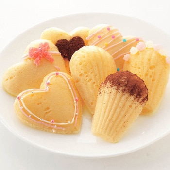 電子レンジを使って、おいしいお菓子作り!ハート型とシェル型のマドレーヌ、おやつにぴったり。ホットケーキミックスと電子レンジで手軽にお菓子作りが楽しめます。加熱時間も短時間なので、お手軽に2種類のマドレーヌが作れます。一口サイズで食べやすいです。