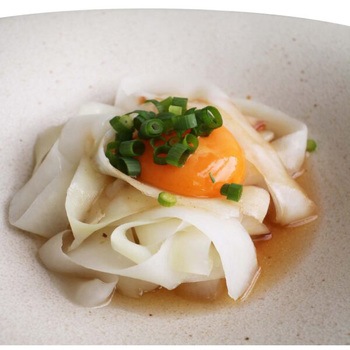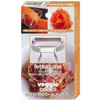 平麺により多くのソースを絡めるために剥くと薄い溝が出来るピーラー。幅8×厚み1.2mmの平麺状に剥けます。平麺状の”フェットチーネ”は野菜の味が強く出る【野菜麺】に仕上がります。濃厚な味覚を持つごぼうやブロッコリー、味噌やチーズなどの発酵調味料がお奨めの組み合わせ。