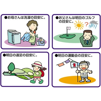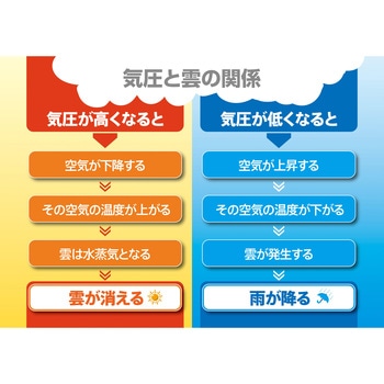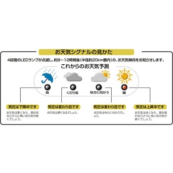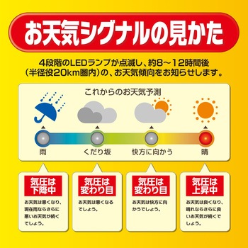 気圧の変化を計測。約半日後のお天気をお知らせする掛け時計。「晴」「快方に向かう」「下り坂」「雨」の4つのシグナルでお知らせします。就寝前に見ると翌朝頃の、朝に見ると今晩頃のお天気傾向がわかります。気圧の変化から体調管理の目安としても役立ちます。冷暖房運転や室内環境の目安として役立つ温度計、湿度計も搭載。